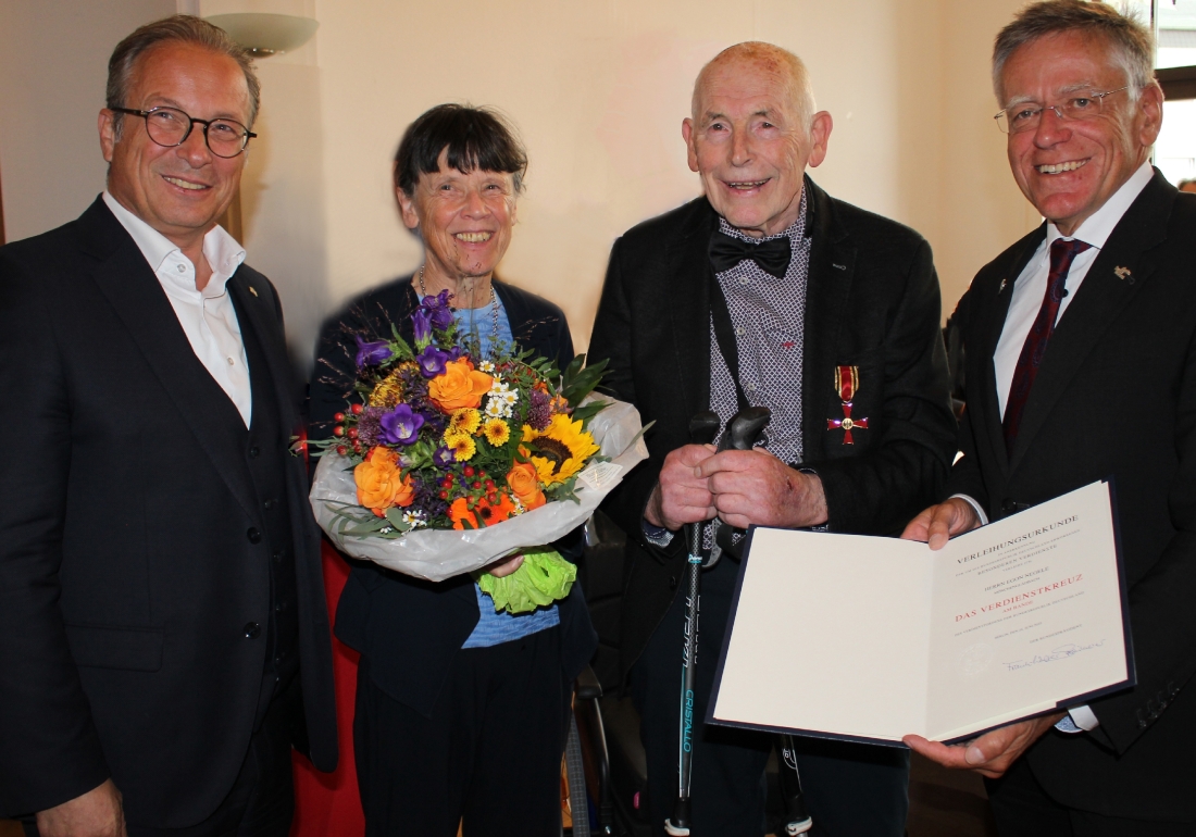 Für seine herausragenden Verdienste um das Gemeinwohl wurde Egon Negele am 17. Sept. 2025 mit dem Verdienstkreuz am Bande ausgezeichnet. Bereits seit den frühen 1970er Jahren engagierte sich Egon voller Energie für verschiedene caritative Einrichtungen sowie Kultur- und Sportvereine, teils über mehrere Jahrzehnte. Er war 10 Jahre lang Schatzmeister des Fördervereins Neusser Musikschule und 37 Jahre nebenamtlicher Geschäftsführer des Rheinischen Landestheaters (RLT). Er half jahrelang dem Altenheim in Glehn und sorgte mit seiner Musik-Band für gute Stimmung im Korschenbroicher Seniorenhaus. Als begeisterter Sportler führte er beim RLT den Betriebssport ein, trieb Sport mit den Bewohnern eines Seniorenheims und war 16 Jahre Vorsitzender des Neusser Skiclubs.